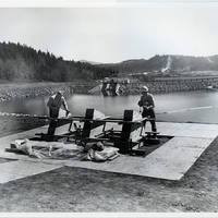 Black and white image of a concrete sign for Scoggins Dam and Henry Hagg Lake. The dam and the spillway opening can be seen in the background. Scoggins Dam and Henry Hagg Lake were constructed as a part of the a larger project to provide drinking water and irrigation for farms and communities in the Tualatin River watershed. Construction on the dam began in June of 1972, and the lake was opened for public recreation in the summer of 1975. Washington County maintains the recreation area and the dam with the help of the local Elks lodges, while the facilities and the lake are owned by the Bureau of Reclamation. Scoggins Dam is named for Gustavus Scoggin, whose family settled in what would become Washington County in 1848. Henry Hagg was a long time resident of the Scoggin Valley and had been one of the original initiators of the Scoggins Dam project in 1934.