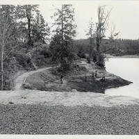 Black and white image of a youth crew working to clear ground at Hagg Lake Park. Some areas were cleared because the water level was expected to rise and cover the ground; others were cleared to provide access to the lake for fishers and other recreational users. Hagg Lake Park was the first county park in Washington County and was named for Henry Hagg, a long time resident of the Scoggins Valley and one of the original initiators of the Scoggins Dam project in 1934.