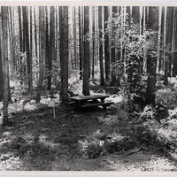 Black and white image of a picnic table with a raised grill at Hagg Lake. Hagg Lake Park was the first county park in Washington County (as opposed to local civic governments), providing a much needed non-urban park in the area. The park's construction was funded as part of the Bureau of Reclamation's larger Tualatin Project, but the county took over maintenance once the park was completed. Henry Hagg was a long time resident of the Scoggins Valley and had been one of the original initiators of the Scoggins Dam project in 1934.