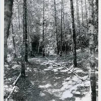 Black and white image of a newly constructed trail at Hagg Lake. Fifteen miles of hiking and bicycling trails were eventually constructed at Hagg Lake. Hagg Lake Park was the first county park in Washington County, created when the Bureau of Reclamation built the Scoggins Dam and Hagg Lake was formed in the mid-1970s. Henry Hagg was a long time resident of the Scoggins Valley and had been one of the original initiators of the Scoggins Dam project in 1934.