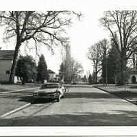 Black and white image looking down 16th Avenue in Forest Grove, Oregon. This street was previously known as Fourth Avenue South. This photograph was apparently taken in order to illustrate the changes that had occurred on the street since the 1910s, comparing it to a postcard photograph that was published in 1912. A number of large houses are visible on either side of the street, and cars are parked along the left side of the street. Large oak trees, pines, and other trees are visible. The street is paved with poured sidewalks and curbs on either side. Power lines are visible along the right side of the image. WCMpic_013317 shows the same view seventy-five years prior in 1912.