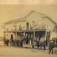A photograph of the Western Hotel in Forest Grove, probably dating from the 1880s or early 1890s. The building is a two-story, cross-gabled hotel with a large covered porch supporting a balcony. Four men stand on a wooden step that was likely used for getting on and off stages or wagons that stopped at the hotel. More men line the boardwalk in front of the building, while women and children gather on the balcony above them. A sign above a door on the image right of the building reads "hotel." A note on the back of the photograph identified this as the Western Hotel, which according to the 1892 Sanborn Map of Forest Grove, was next door to Johnson Brothers' Livery Stable. The brick livery stable still stands on the southeast corner of Main St. and Pacific Ave. in Forest Grove, but the Western Hotel is no longer there.