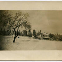 Sepia-toned image of a two-story 'American Foursquare' home with a hipped roof, a side addition, and a screen-in porch attached. Snow covers the house, the fields, and the evergreen trees behind the home. Barns and outbuildings are also covered with snow. Museum records identify this as the 'Ward family farm in the Tualatin Valley, south of Hillsboro, ca. 1918.