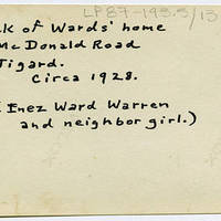 [back] [felt pen] Back of Wards' home on McDonald Road in Tigard. Circa 1928. (Inez Warren and a neighbor girl.)