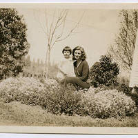 Sepia-toned image of a young woman crouched down next to a young girl in a white dress. Museum records identify the image as that of ' Inez Warren and a neighbor girl;' Inez is most likely the older girl in the image.