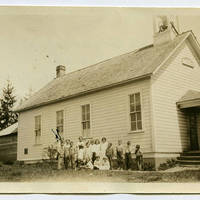 Sepia-toned image of a small group of students gathered outside a one-room school house. An arrow drawn in pen points to a young girl at the end of the back row, most likely identifying Inez Ward Warren, the donor of the photo. Firdale was one of many 'walking' schools in Washington County, small, rural schools situated where their students could walk to class.