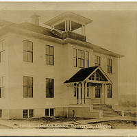 Sepia-toned image of a two-story school building with a basement, front porch, bell tower, and dormer windows in the roof. A 'graded' school separated children into grades by age, rather than a one-room school where students were grouped according to where they were working in any particular curriculum.