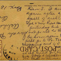 [front] [white ink] 8485a Graded School, Beaverton, Oregon. [back] Sarah Fix, Ashland Oregon, Box 13 --. [letter] Dear S - I am up again after a hard spell of sick headache. Syd & Mr. Ross came down yesterday but I could not go with [illegible]. They will be down again Mon. I will go to Po. Tues. Dr. then shopping and if I don't go any farther then will head for home Tues Eve. Stop at Woodburn & [illegible] on Wed. or Thurs. S. L. A. [postmark] Hillsboro, Apr. [illegible] 1909.