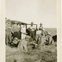 Sepia-toned image of a group of men sitting in a field. A woman holding a dish of food stands in the open door of the car, and several of the men gathered about the car appear to be eating and three or four hold coffee cups in their hands. The field behind them is full of rows of harvested grain. In the early 1900s machinery was expensive, and most farmers did not own their own harvesting machinery. Instead paid crews such as this one for the few days it would take to harvest their crops. The crew would then move on to the next farm in the area ready for harvest, or on to another area entirely. Museum records do not identify either the people in the picture or their location, but the photo was part of the Herbert McMullen bequest. McMullen was a local photographer who, in addition to taking his own photographs, collected images that depicted daily life in the area.