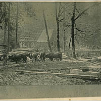Sepia-toned image of a man with four teams of oxen standing near a partially constructed building in a heavily wooded area. A number of people stand watching on a raised platform or bridge in the background, including several with bicycles. More people stand inside the unfinished building, all looking toward the camera. A large wheel and some unidentified machinery sits at the right end of the building, while a large pile of lumber fills the space between the yoked oxen and the building. The man in the foreground wears workpants, suspenders, a dark shirt and a dark hat and has dark hair. Museum records identify the image as 'Gypsy [Roma] loggers, with oxen,' but do not give a specific location. This photo was part of the Herbert McMullen bequest. McMullen was a local photographer who, in addition to taking his own photographs, collected images that depicted daily life in the area.