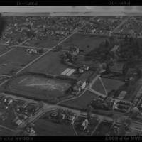 Black and white image of Pacific University showing Old College Hall at the center. Most notably, there are only four other main buildings and one house situated throughout a rather large grassy area with a few trees planted in rows. A large oval track dominates the lower left of the image.