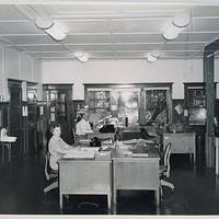 Black and white image of an office interior. Four desks are visible; a woman sits at one while a man sits at a desk near the window. She has a telephone on her desk, he has a typewriter as well as a telephone. A water fountain extends from the wall at the left of the image.