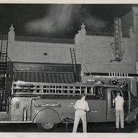 Black and white image of two men beside a hook and ladder fire engine parked on a city street at night. One man is standing at the cab while another waits. Ladders can be seen leaning against the buildings behind the fire truck, and a man at the far left of the appears to be waiting for something as he stands next to a ladder. Smoke billows from the top of the building.