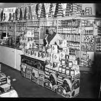 Black and white image of the interior of a grocery store. Cans fill the shelves, but the focus of the picture is a woman dressed as 'Aunt Jemima' to promote her ready-made pancake and buckwheat corn and wheat flour mixes. Jars of coffee grounds and pet milk fill in the end of the display. Museum records identify the location as the Fairway Grocery Store in Hillsboro.