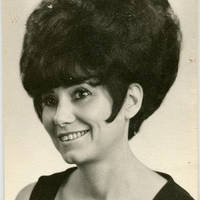 Black and white portrait of a woman wearing a dark, sleeveless top and a large beehive hairstyle. This image was part of the Herbert E. McMullen bequest, and appeared to be one of several intended to document hairstyles of the day. McMullen was a local photographer who also collected other images of daily life in the area.