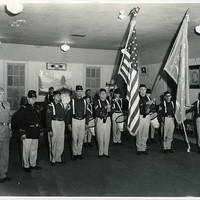 Black and white image of a group of men assembled in a room, dressed mostly in uniforms typical of the Union Army in the American Civil War. Most wear dark shirts, light pants, shoes and suspenders. One man wears a sergeant's uniform. Two men in the center of the front row hold a United States flag and another flag, though they appear to be modern versions of the flag. The second row is young men and boys with drums, while a few other men stand in the background. An Oddfellows sign hangs on the wall in the back of the image. Museum records identify the men simply as an American Legion group, but this image was part of the Herbert E. McMullen bequest. McMullen was a local photographer who also collected other images of daily life in the area.