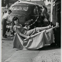 Black and white image of a bride and groom, evidently about to leave on their honeymoon. The bride wears a suit and a dark hat and is seated in a canvas covered wheelbarrow. The groom, in a suit, holds the handles of the wheelbarrow. In the background, a car is being decorated with streamers and cans tied on the back. 'Just Married' has been written on the trunk. This image is part of the Herbert McMullen bequest. McMullen was a local photographer who owned a studio in Hillsboro; he also collected images of local life taken by other photographers.