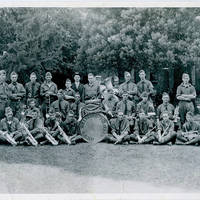 Black and white image of a group of men in military uniforms. Gathered into a group in front of what appears to be the Washington County Courthouse, some are seated, some are kneeling, and some stand. Most hold instruments of some sort, including saxophones of various sizes, trombones, trumpets, clarinets, French horns, and other brass instruments. A large bass drum with a snare sit in the center o the group, and young man with drumsticks in hand kneels behind them. 'Hillsboro Military Band' is printed on the bass drum. A man in a suit with a fedora and a man in a white shirt with a straw boater hat stand behind the group.