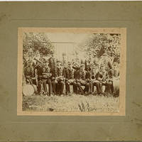 Sepia-toned image of a band in uniform, seated in a garden in front of a fence. Most of the band members hold instruments: drums, trumpets, flugelhorns, etc. One holds a bass drum, and another has a snare drum on the ground beside his feet. The fronts of their uniforms are decorated on both sides with elaborate curvilinear designs that are repeated on the collars. Each man wears a captain's hat that matches his uniform.