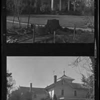 Black and white images of a large, cross-gabled house from two different angles. the house is two story and features a cupola in the middle of the main section. A front porch with columns runs along the front of the home, and a large, well-kept lawn stretches out in front of the house. Museum records are not specific as to who owned the home or where it was located.