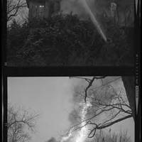 Black and white images of a house being burned down. The house appears weathered and is in the midst of an overgrown yard. In the upper image, a fireman directs a spray of water directly against flames on the roof of the house. See WCMpic_015330 for an image of this house intact.