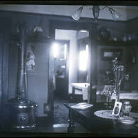 Black and white image depicting an interior room of a house. A woodstove stands against one wall, while a table fills the lower right foreground. A newspaper, book, doily, and several vases holding flowers are scattered about the table, and a picture of a woman in a Victorian dress leans against an urn. In the background is another small table, covered in a cloth with several books sitting on it. A shelf runs along the upper wall below the wainscoting; it holds plates and teapots. Through an open door two windows let in bright daylight, and another table with a cloth can be seen. The floors are wooden and a rug runs along the floor immediately in front of the door to the other room. A light fixture with decorate glass shades hangs from the high ceiling.