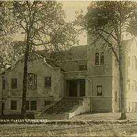 Sepia-toned image of a large, two-story Mission revival style church with a large, square bell tower. Elaborate stained glass windows fill the visible facades, and a long flight of stairs leads up to a recessed entrance. The church sits in a grassy yard, and a sidewalk runs beside it. Several tall, slender oak trees are set about the edge of the lawn.