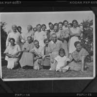 A group portrait of women from the Ladies Guild of the Reformed Church of Helvetia, Oregon in 1937. Many of the members of this church were from Swiss or German immigrant families. Its original language for church services was German, although by the time this photograph was taken, most services were in English. The women wear comfortable dresses, most with shorter sleeves and buttons up the front. A man in a suit (possibly the church pastor?) stands at the very back of the group.