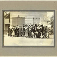 Black and white image of a group of women gathered in front of a wooden building. The sign hanging above them indicates the building is the Public Library and it has a rest room in side. Some of the women wear fur coats; most wear somewhat shapeless dresses of the style in the 1930s. Cloche hats and round, dark framed glasses further set the photo in the late 1930s.