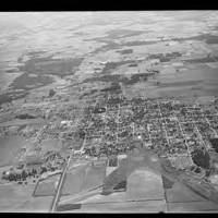 Black and white view of Hillsboro, looking north. The Washington County Courthouse can be seen in the dark square of trees at the northwest corner of the city; identifiable by the Sequoias at the south entrance and the flagpole on the east side. The other darker square to the right and up one block is Bagley Park. See WCMpic_015500 for a similar view, ten years later.