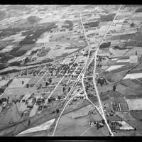 Black and white aerial image of Beaverton, looking east. This appears to be downtown Beaverton, showing Farmington Road and Canyon Road or Tualatin Valley Highway.