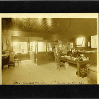 Sepia-toned image of two men standing inside a building with a number of desks and tables. A teller's cage fills the area directly behind the men, separating the entrance from the interior of the bank. Both men wear suit coats and ties. Otto Galaway, bank teller, stands to the image left of Wheelock Marsh, the vice-president. The Washington County Bank opened in 1909; Galaway left in 1921 to open a bank in Vernonia.