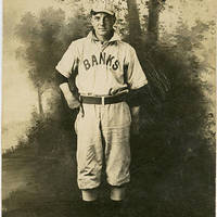 A member of the local baseball team of Banks, Oregon circa 1900. The man is wearing a traditional striped baseball uniform of knickers and loose fitting, short-sleeved buttoned shirt, with a baseball cap. He wears a dark, long-sleeved shirt beneath the light-colored uniform shirt, and his knickers are tucked into thick, two-colored socks that disappear into lace-up boots. 'Banks' is lettered across the front of his shirt. He stands in front of a misty, romantic studio backdrop.