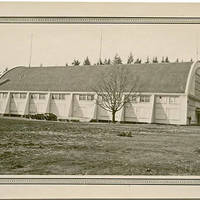 Black and white image of a large, Quonset hut-styled building, showing the round barreled roof on top of a wall with external buttresses. A row of pine trees is visible beyond the building, and an empty yard fills the foreground of the image.