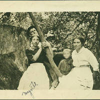 Black and white image of two women, a child, and a man, seated on a stump in the forest. The women wear blouses and skirts, and at least one wears an apron. The child's face is blurred, and the man sits behind the women, leaning and looking over one woman's head. 'Myrtle' is written on the picture, indicating the woman on the left of the image.