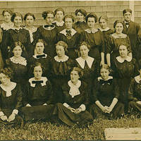 Sepia-toned image of a group of young women with an older woman and one man. The young women all wear dark dresses with white or lace collars, and many wear ties or ribbons at the neck. Their hair is parted in the middle and pulled back; all the women wear their hair up. Some sit on the ground. Ella Garrigus Hutchens, is seated second from the left in the front row. Ms. Hutchens was a long time resident of the area.