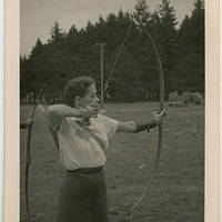 A woman draws her bow during an archery contest at the Washington County Fair in 1940.