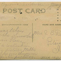 [back] Byrons [sic] residence in May 1908; This was taken when the Snowballs were in bloom. Quite a contrast in the two pictures Melba calls them out Summer and Winter pictures. [addressed to] Mrs. J. B. Deegan Peterson Iowa