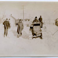 Several men stand in the snow on Watson Street in Beaverton, while two other men ride snowmobiles.