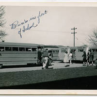 A group of school buses stand in front of a school in Washington County, Oregon.