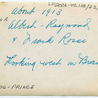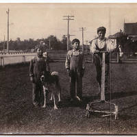 [back] about 1913; L to R Albert - Raymond + Frank Rossi. Looking west on Broadway; Dog - Prince