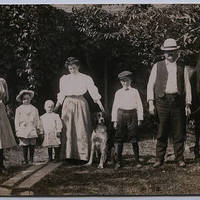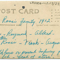 [front] 1904 [back] Rossi Family 1912; Elva - Raymond - Albert - Mrs Hattie Rossi - Frank - August Rossi; Old home on present Safeway parking lot - west of store.