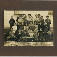 Group portrait of the students of the Jackson School, in front of their schoolhouse. Two students hold a sign reading 'Dist. No. 9.'