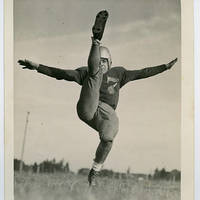 - A kicker on a football team poses in mid-kick.