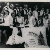 Group of men and women holding a banner that reads Cloudy Mountain Cloggers of Oregon.