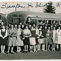 A group of students stand in front of their school bus, which ran on route #4 for Beaverton High School in the 1940s.