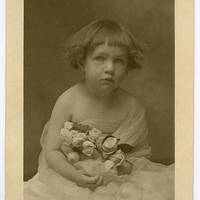 Studio portrait of Martha Emerick holding a bunch of flowers. Her father was Alva James Emerick.
