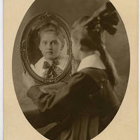 Portrait of Eva Sorenson, taken to show her face as a reflection in the mirror she is holding.