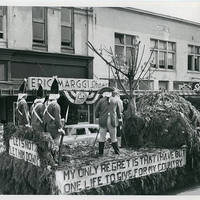 Black and white image of several men dressed as Colonial and British soldiers from the American Revolutionary War. The Colonial soldiers stand beneath a tree mostly bare of leaf, while the British soldiers stand at the back of the trailer. Signs hanging on the trailer quote famous sayings attributed to patriots of that era. A large sign reading 'Eric Marggi Shoes' dominates the background of the image. This photo was part of the Herbert McMullen bequest. McMullen was a local photographer who also collected other images of daily life in the area.