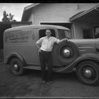 Black and white image of a man leaning on the externally mounted spare tire of a delivery van. The man wears dark pants, a belt, and a checked shirt. He has short hair and glasses. In the background is a two-story building with a covered porch and what appears to be an open garage door. Printed on the upper side panel of the van is printed 'Ray J. Mann, Distributor. Hillsboro, Oregon.' Two liquor bottles frame the lettering. This image was part of the Herbert McMullen bequest. McMullen was a local photographer who also collected other images of daily life in the area.